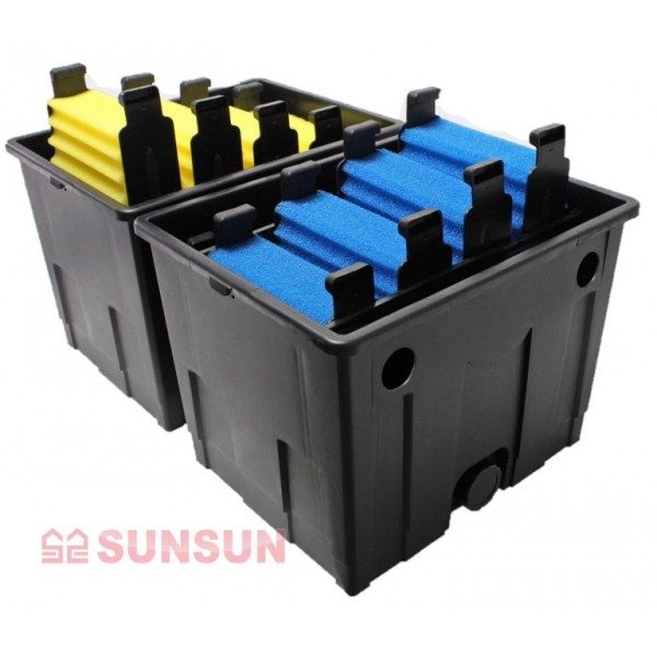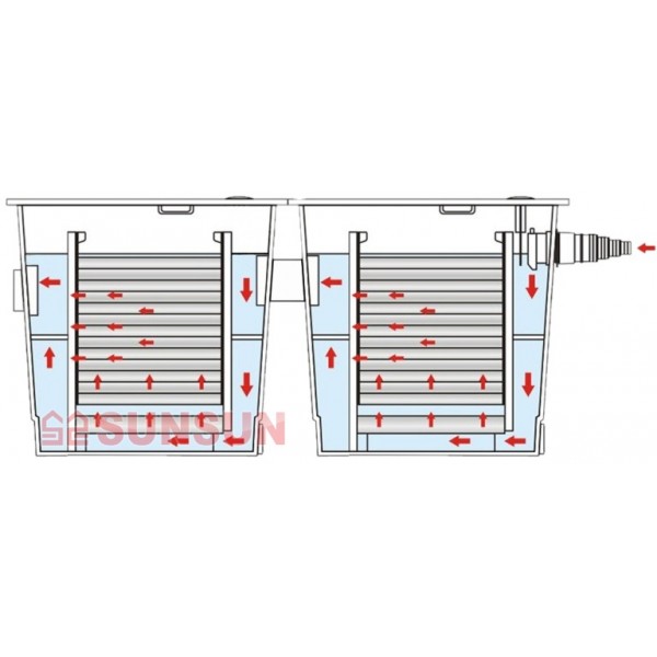 Фильтр SunSun 350B-UV прекрасно подходит для прудов объемом от 30 000л до 60 000л (при наличии живых растений и без рыбы), обеспечивая надежную механическую, биологическую и химическую (при наличии соответствующих наполнителей) фильтрацию. Поскольку вода в фильтре циркулирует снизу от UV стерилизатора, наполнители закладываются от крупнопористого к мелкопористому. Наполнители для биофильтрации (керамику и биошары) лучше располагать сразу после крупнопористой мочалки.