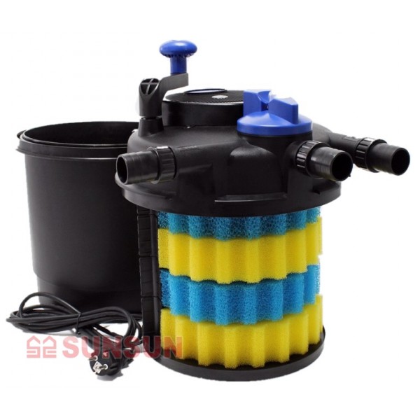 Вместе с соответствующим насосом (который не входит в комплект, обратите внимание на рекомендуемую мощность прудового насоса) напорный прудовый фильтр SunSun CPF-10000 с встроенным UV стерилизатором является оптимальным бюджетным решением для пруда объемом до 12000л.