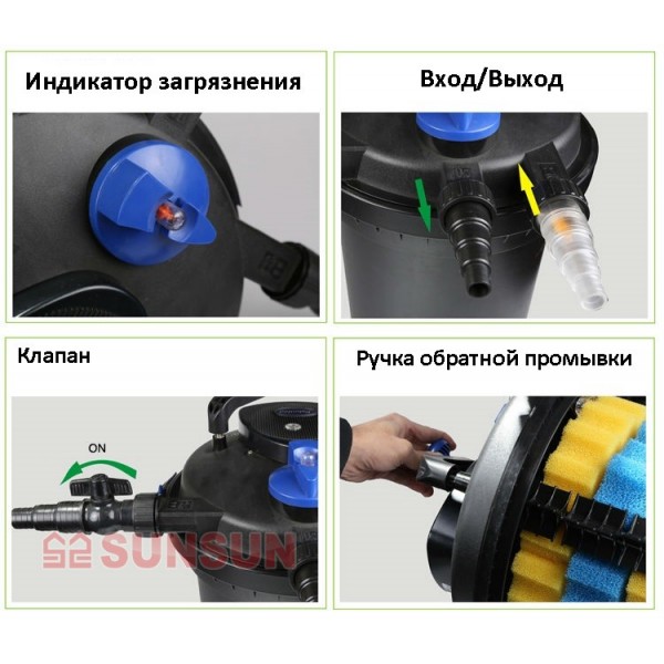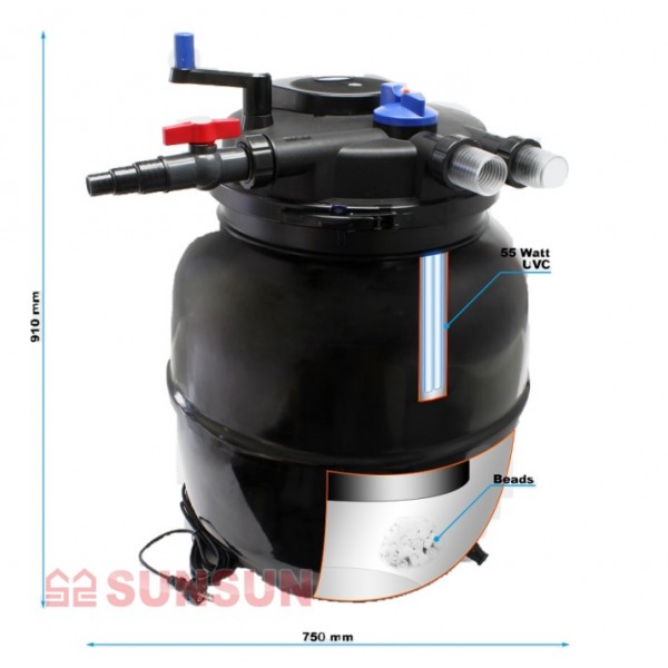 Вместе с соответствующим насосом (который не входит в комплект, обратите внимание на рекомендуемую мощность прудового насоса) напорный прудовый фильтр SunSun CPF-50000 с встроенным UV стерилизатором является оптимальным бюджетным решением для пруда объемом до 100000 л.