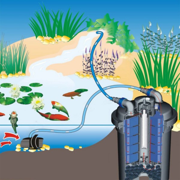 Для работы фильтра нужен прудовый насос производительностью 6500-10000 л/ч.